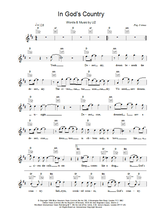 Download or print U2 In God's Country sheet music, chords and digital score arranged for Guitar Tab. This Rock score includes 7 page(s).