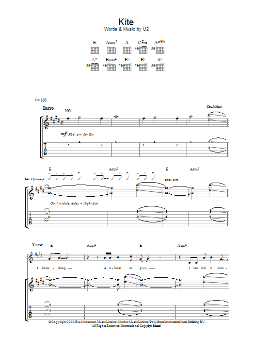 Download or print U2 Kite sheet music, chords and digital score arranged for Guitar Tab. This Rock score includes 9 page(s).