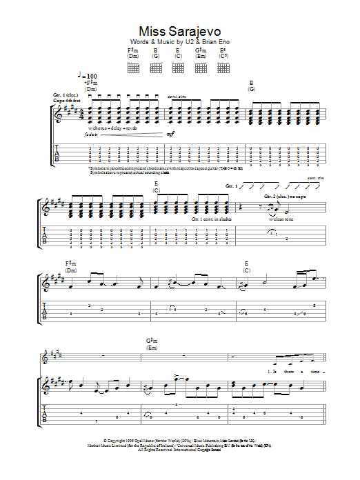 Download or print U2 Miss Sarajevo sheet music, chords and digital score arranged for Piano, Vocal & Guitar Chords (Right-Hand Melody). This Pop score includes 7 page(s).