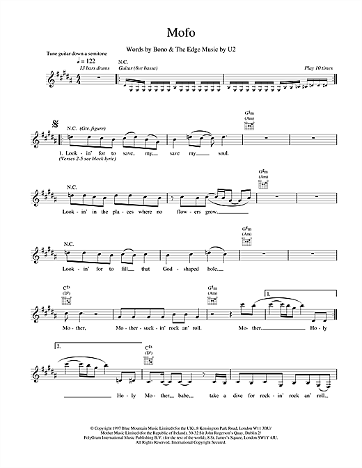 Download or print U2 Mofo sheet music, chords and digital score arranged for Lead Sheet / Fake Book. This Rock score includes 3 page(s).