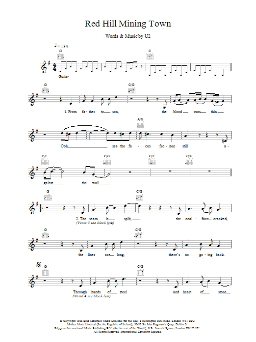 Download or print U2 Red Hill Mining Town sheet music, chords and digital score arranged for Guitar Chords/Lyrics. This Rock score includes 3 page(s).