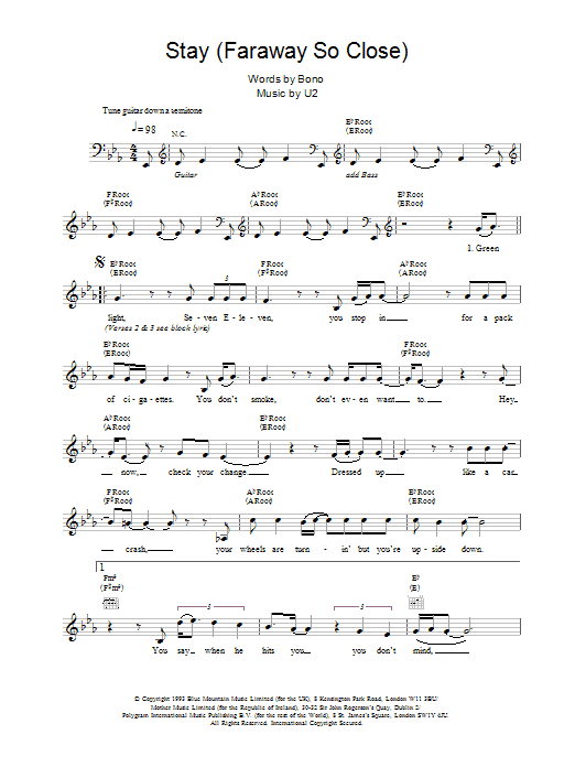 Download or print U2 Stay (Faraway, So Close) sheet music, chords and digital score arranged for Guitar Tab. This Pop score includes 7 page(s).