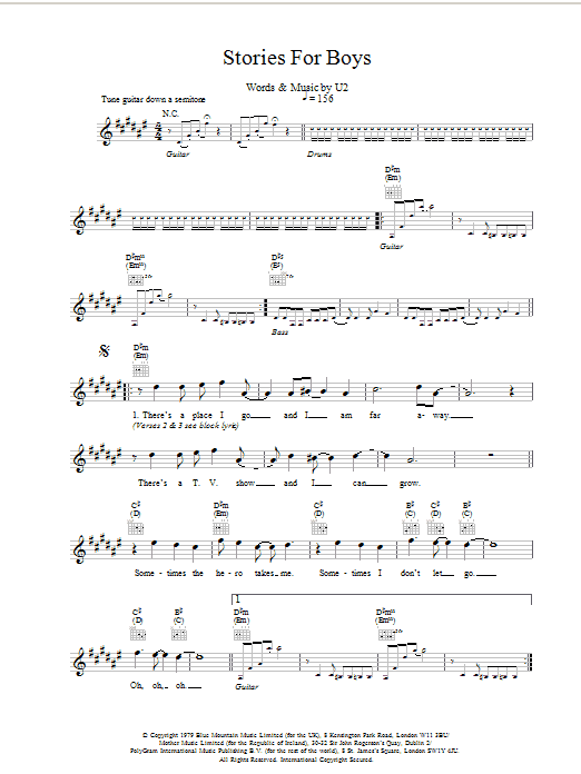 Download or print U2 Stories For Boys sheet music, chords and digital score arranged for Lead Sheet / Fake Book. This Rock score includes 2 page(s).
