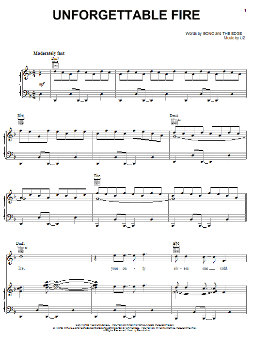 Download or print U2 Unforgettable Fire sheet music, chords and digital score arranged for Piano, Vocal & Guitar Chords (Right-Hand Melody). This Pop score includes 10 page(s).