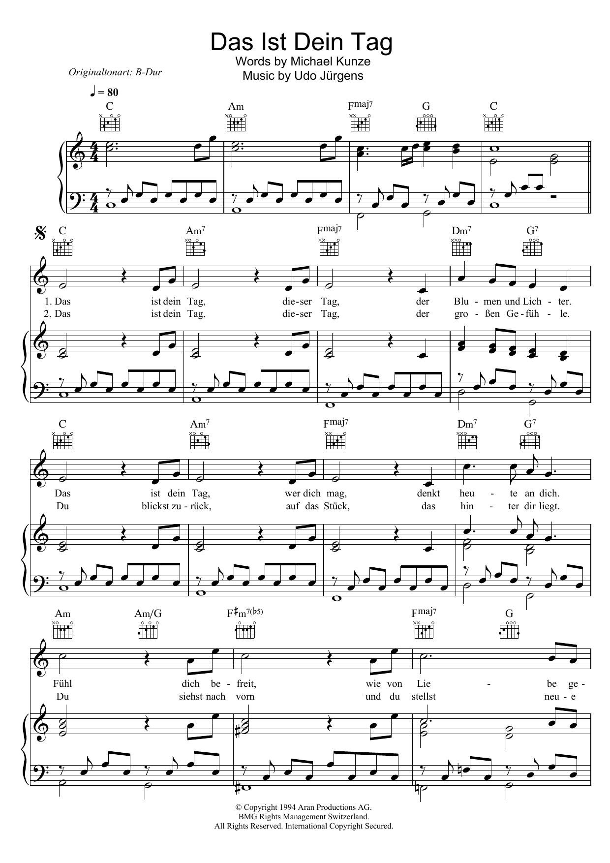 Download or print Udo Jurgens Das Ist Dein Tag sheet music, chords and digital score arranged for Piano, Vocal & Guitar Chords. This Pop score includes 4 page(s).