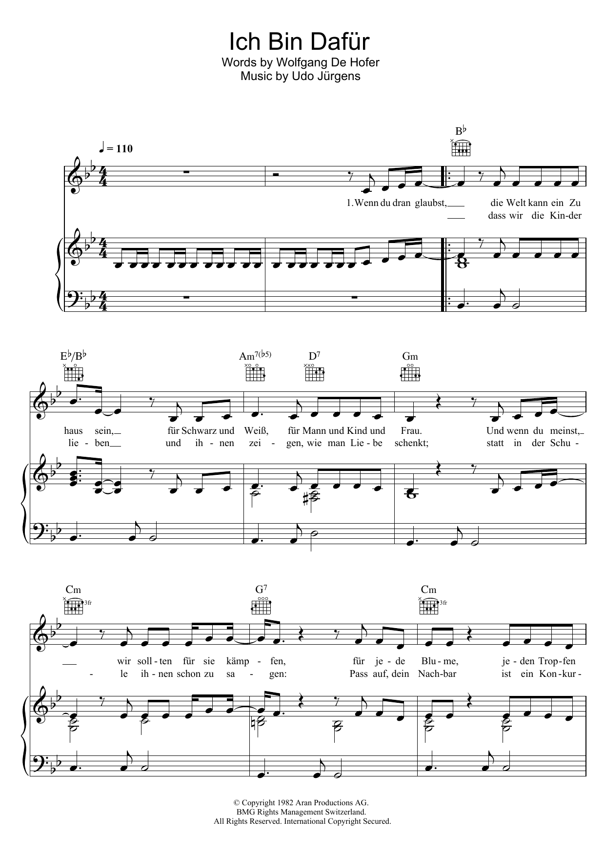 Download or print Udo Jurgens Ich Bin Dafur sheet music, chords and digital score arranged for Piano, Vocal & Guitar Chords. This Pop score includes 8 page(s).