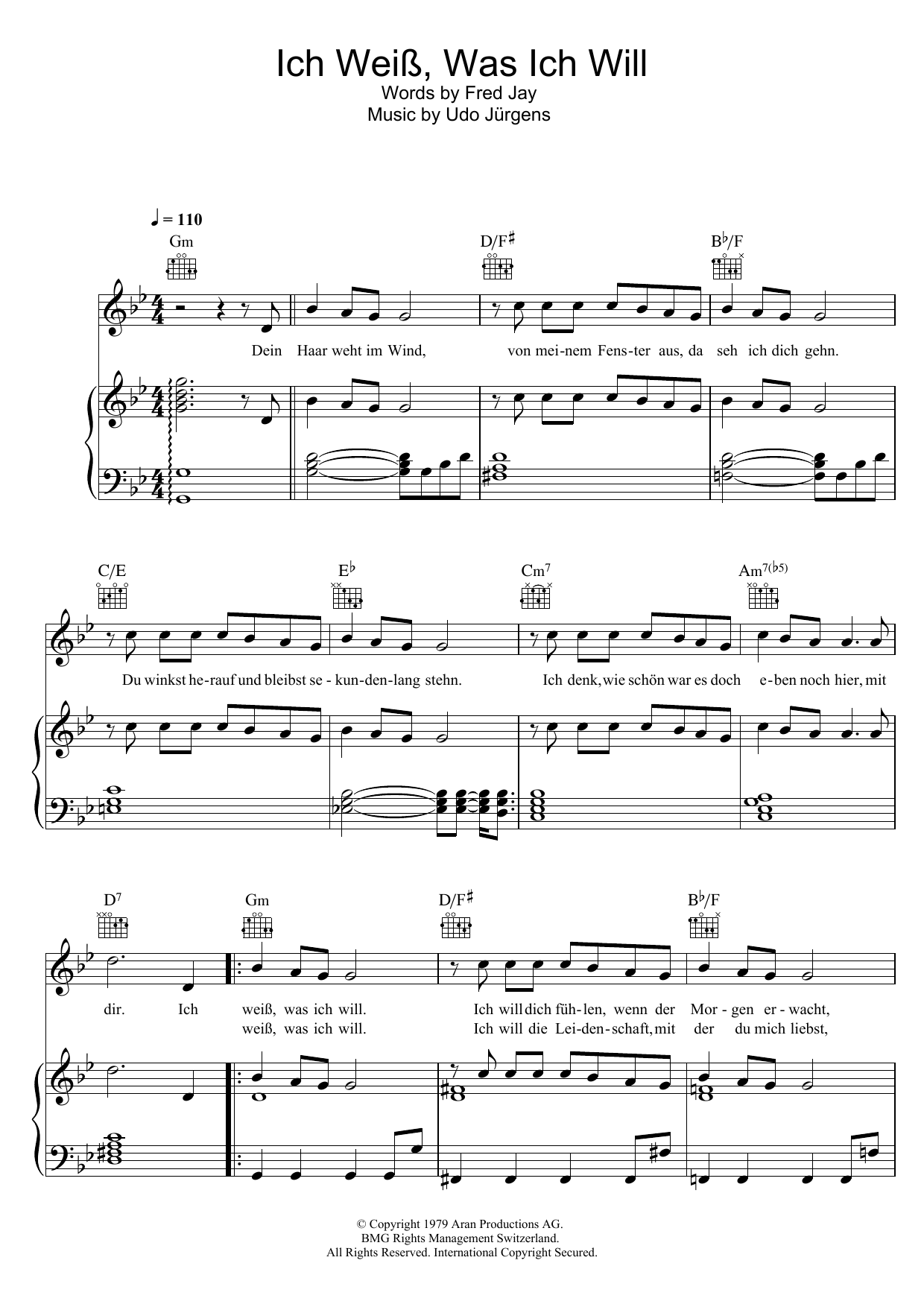 Download or print Udo Jurgens Ich Weiss, Was Ich Will sheet music, chords and digital score arranged for Piano, Vocal & Guitar Chords. This Pop score includes 7 page(s).