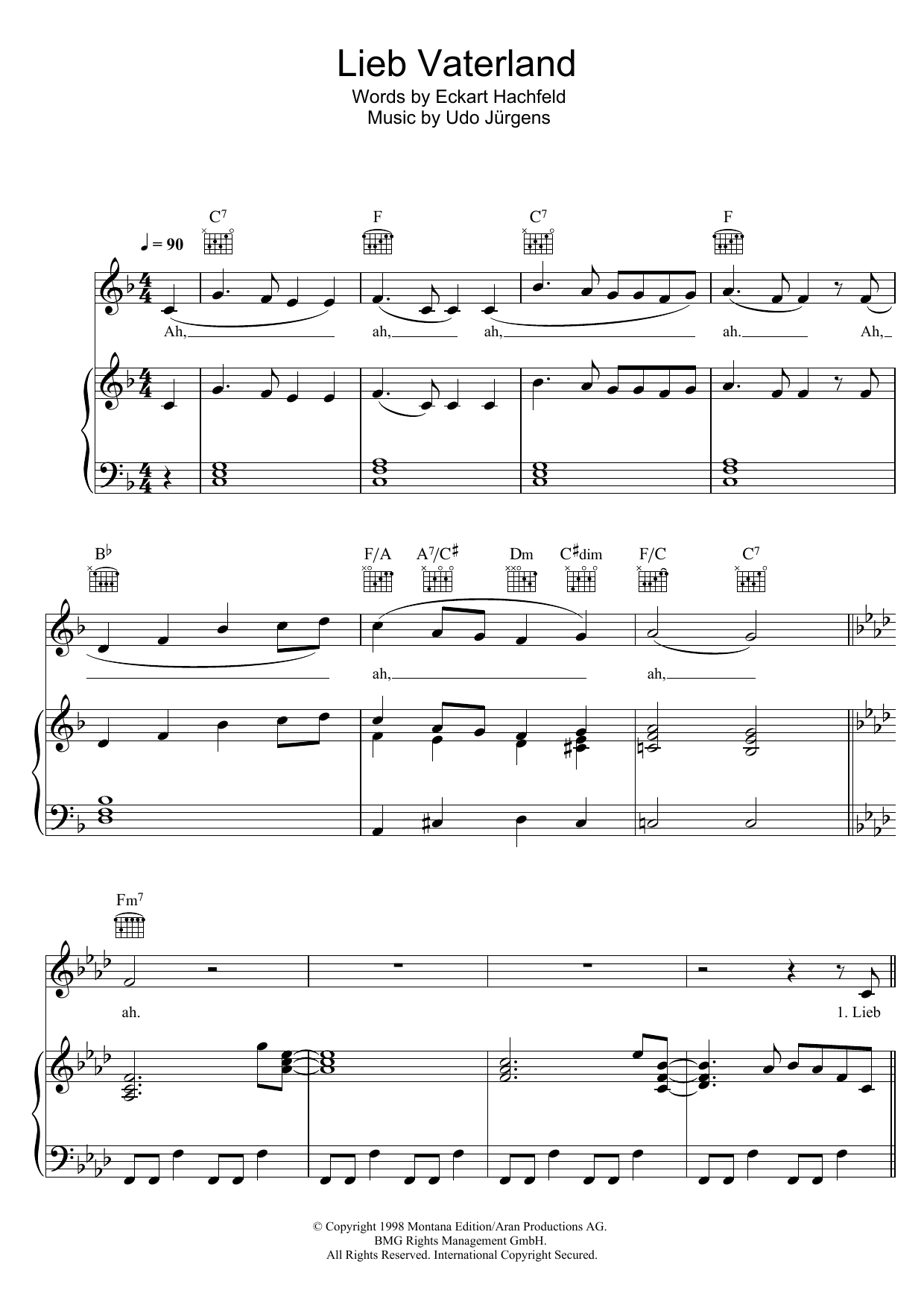 Download or print Udo Jurgens Lieb Vaterland sheet music, chords and digital score arranged for Piano, Vocal & Guitar Chords. This Pop score includes 5 page(s).