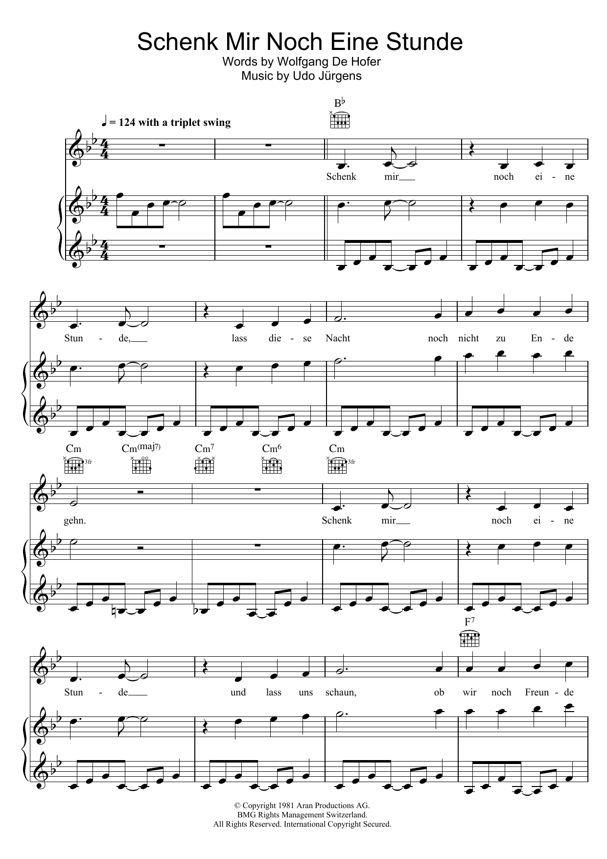 Download or print Udo Jurgens Schenk Mir Noch Eine Stunde sheet music, chords and digital score arranged for Piano, Vocal & Guitar Chords. This Pop score includes 7 page(s).