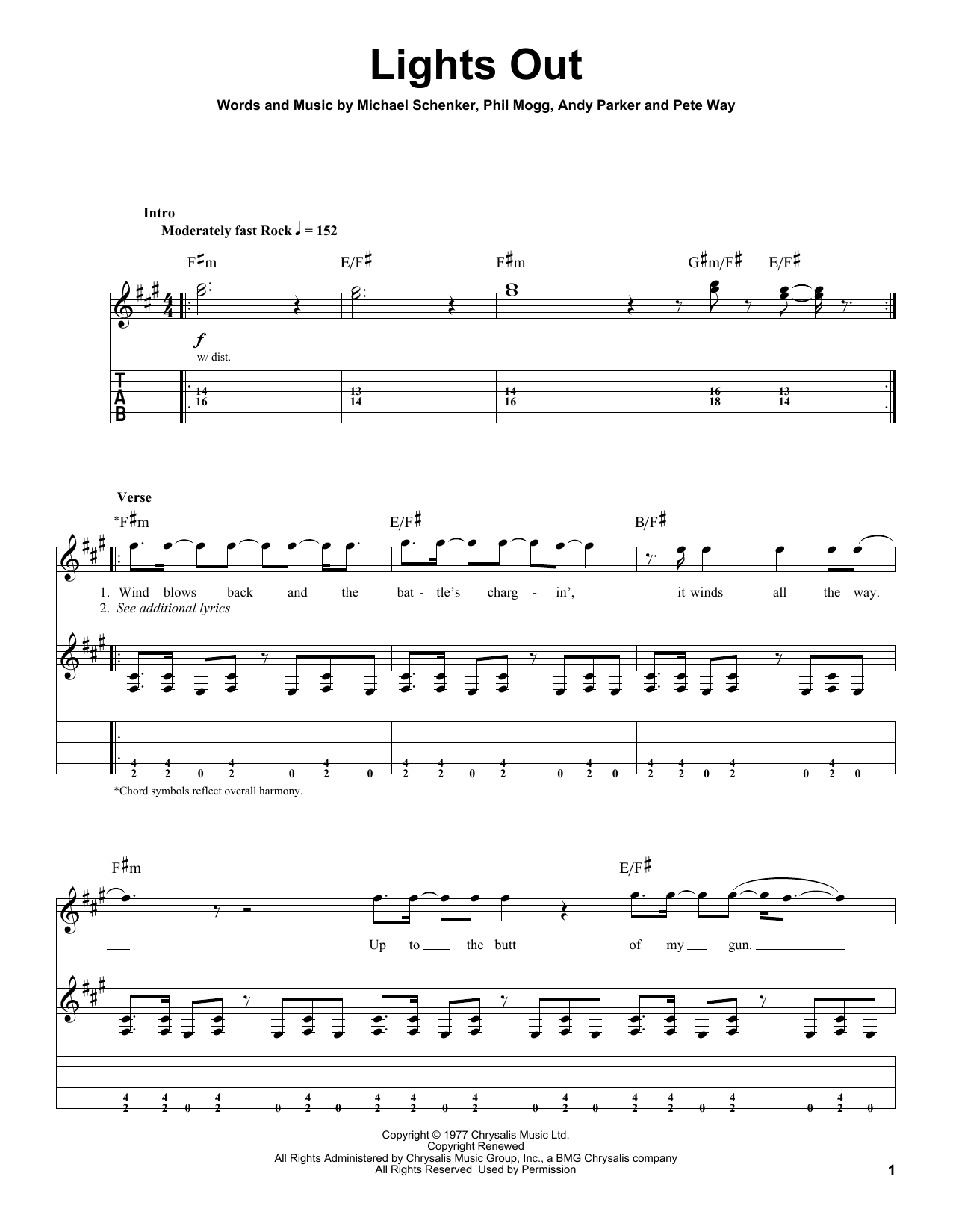Download or print UFO Lights Out sheet music, chords and digital score arranged for Guitar Tab (Single Guitar). This Metal score includes 10 page(s).