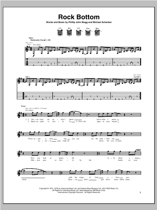 Download or print UFO Rock Bottom sheet music, chords and digital score arranged for Guitar Tab (Single Guitar). This Pop score includes 12 page(s).