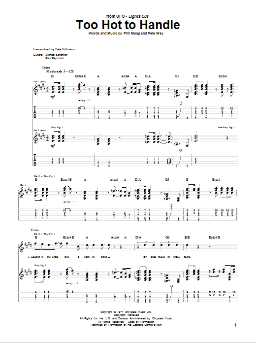 Download or print UFO Too Hot To Handle sheet music, chords and digital score arranged for Guitar Tab (Single Guitar). This Pop score includes 8 page(s).
