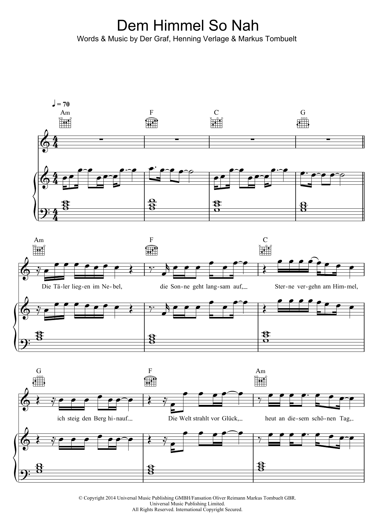 Download or print Unheilig Dem Himmel So Nah sheet music, chords and digital score arranged for Piano, Vocal & Guitar Chords. This Pop score includes 5 page(s).