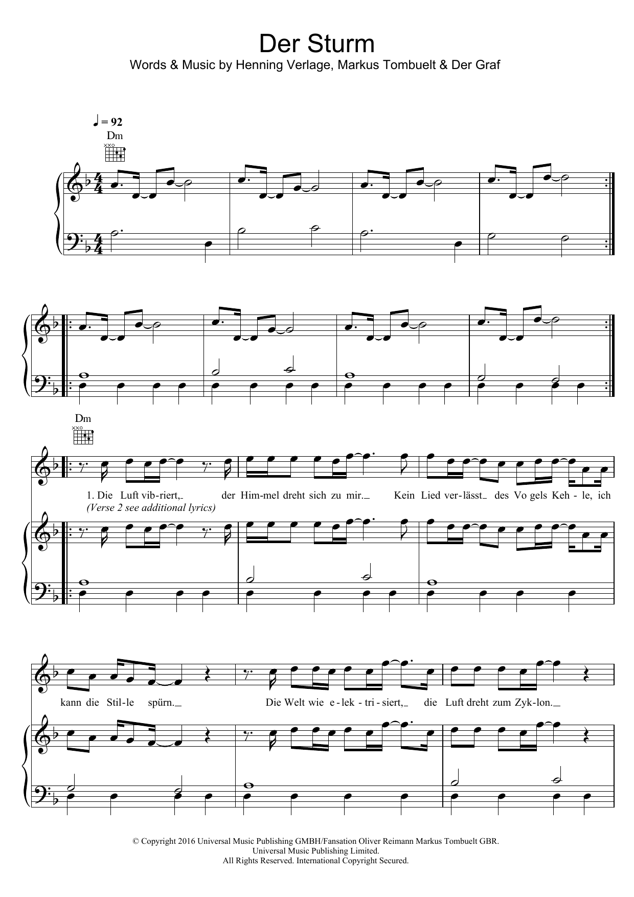 Download or print Unheilig Der Sturm sheet music, chords and digital score arranged for Piano, Vocal & Guitar Chords. This Pop score includes 5 page(s).