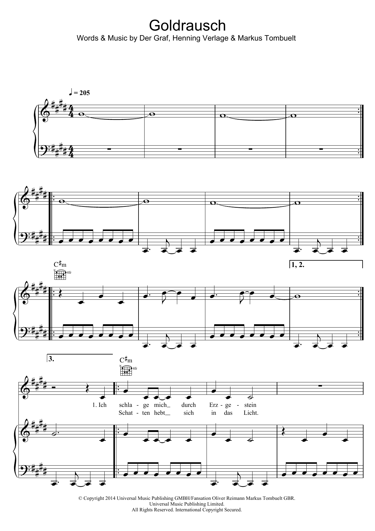 Download or print Unheilig Goldrausch sheet music, chords and digital score arranged for Piano, Vocal & Guitar Chords. This Pop score includes 7 page(s).
