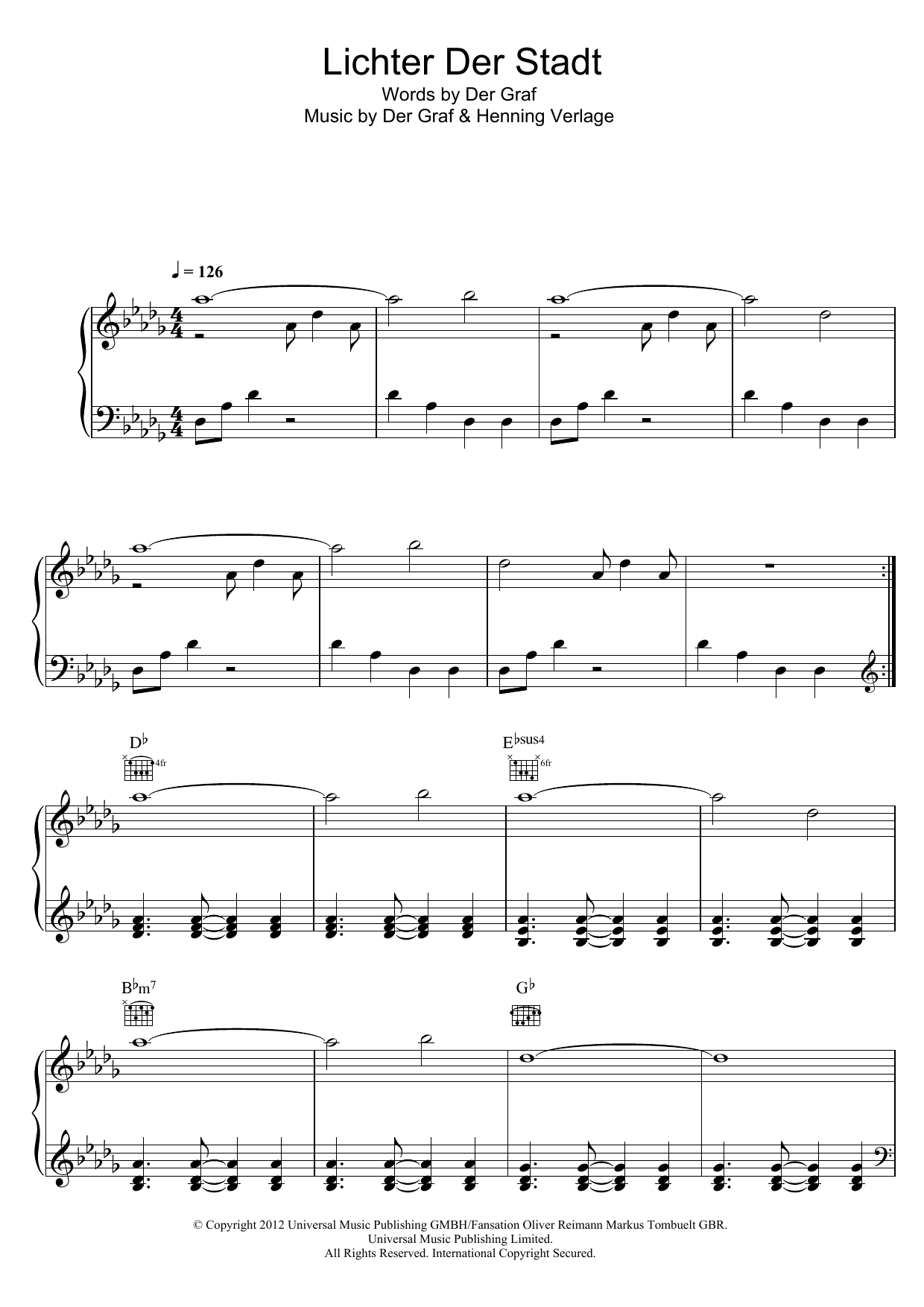 Download or print Unheilig Lichter Der Stadt sheet music, chords and digital score arranged for Piano, Vocal & Guitar Chords. This Pop score includes 8 page(s).
