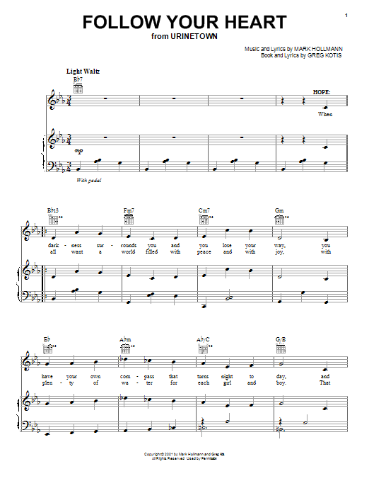 Download or print Urinetown (Musical) Follow Your Heart sheet music, chords and digital score arranged for Piano, Vocal & Guitar Chords (Right-Hand Melody). This Musical/Show score includes 7 page(s).