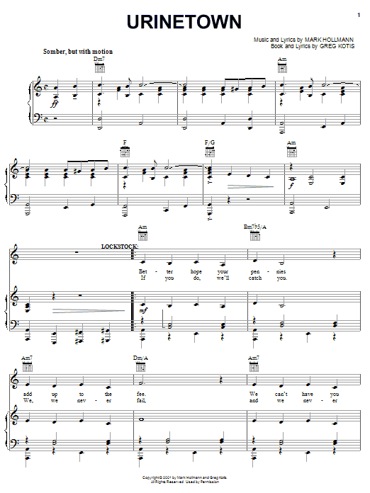 Download or print Urinetown (Musical) Urinetown sheet music, chords and digital score arranged for Piano, Vocal & Guitar Chords (Right-Hand Melody). This Musical/Show score includes 8 page(s).