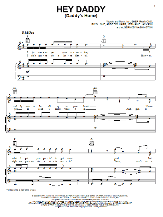 Download or print Usher featuring Plies Hey Daddy (Daddy's Home) sheet music, chords and digital score arranged for Piano, Vocal & Guitar Chords (Right-Hand Melody). This Pop score includes 7 page(s).