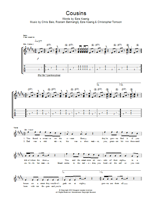 Download or print Vampire Weekend Cousins sheet music, chords and digital score arranged for Guitar Chords/Lyrics. This Rock score includes 2 page(s).