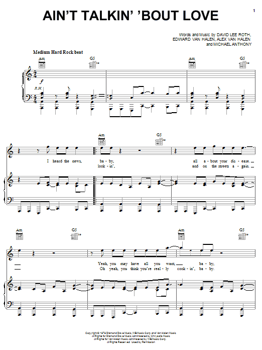 Download or print Van Halen Ain't Talkin' 'Bout Love sheet music, chords and digital score arranged for Guitar Tab (Single Guitar). This Metal score includes 9 page(s).