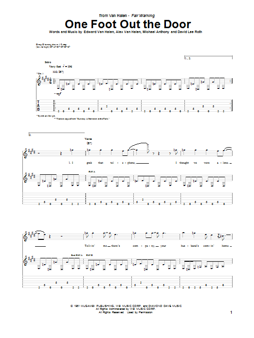Download or print Van Halen One Foot Out The Door sheet music, chords and digital score arranged for Guitar Tab. This Pop score includes 7 page(s).
