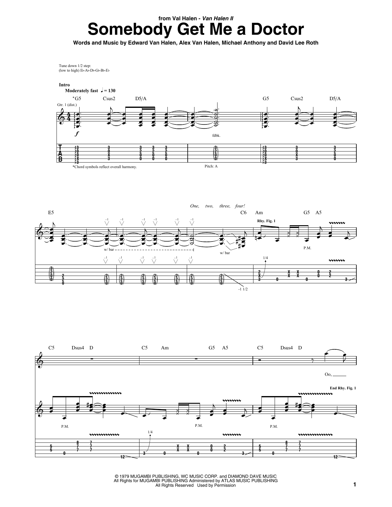 Download or print Van Halen Somebody Get Me A Doctor sheet music, chords and digital score arranged for Guitar Tab. This Metal score includes 7 page(s).