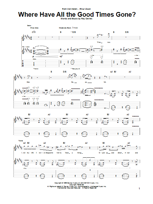 Download or print Van Halen Where Have All The Good Times Gone? sheet music, chords and digital score arranged for Guitar Tab. This Pop score includes 7 page(s).