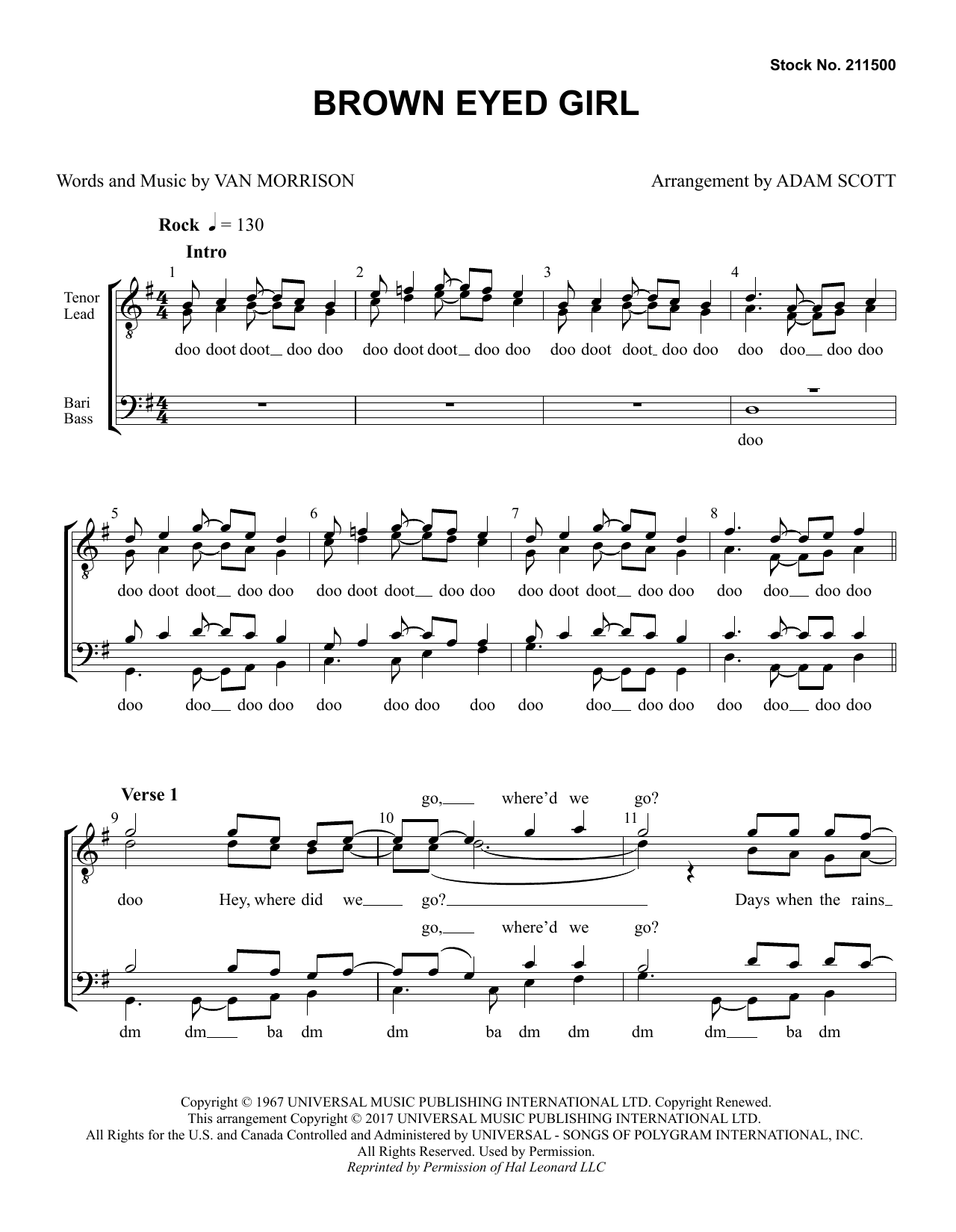 Download or print Van Morrison Brown Eyed Girl (arr. Adam Scott) sheet music, chords and digital score arranged for TTBB Choir. This Barbershop score includes 10 page(s).