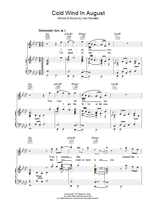 Download or print Van Morrison Cold Wind In August sheet music, chords and digital score arranged for Piano, Vocal & Guitar Chords (Right-Hand Melody). This Pop score includes 5 page(s).