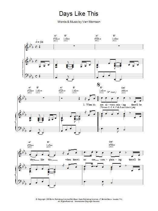Download or print Van Morrison Days Like This sheet music, chords and digital score arranged for Piano, Vocal & Guitar Chords. This Blues score includes 4 page(s).