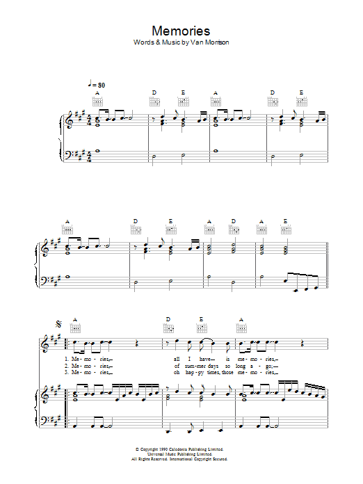 Download or print Van Morrison Memories sheet music, chords and digital score arranged for Piano, Vocal & Guitar Chords. This Pop score includes 4 page(s).