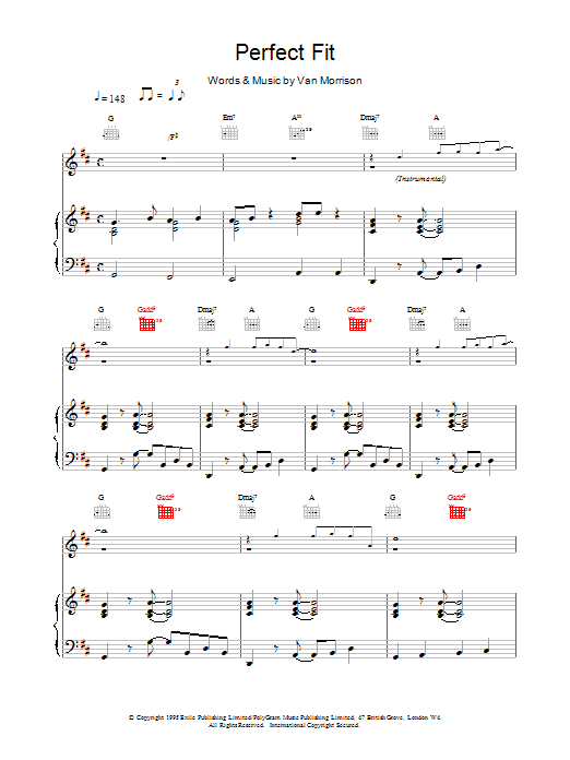 Download or print Van Morrison Perfect Fit sheet music, chords and digital score arranged for Piano, Vocal & Guitar Chords. This Blues score includes 4 page(s).