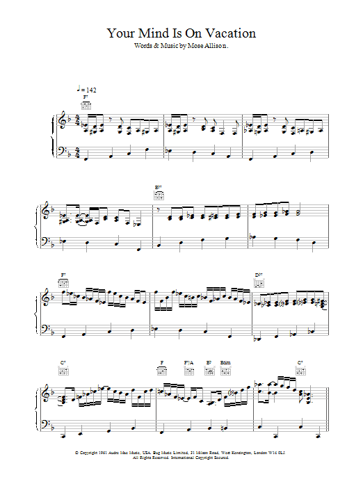 Download or print Van Morrison Your Mind Is On Vacation sheet music, chords and digital score arranged for Piano, Vocal & Guitar Chords. This Jazz score includes 6 page(s).