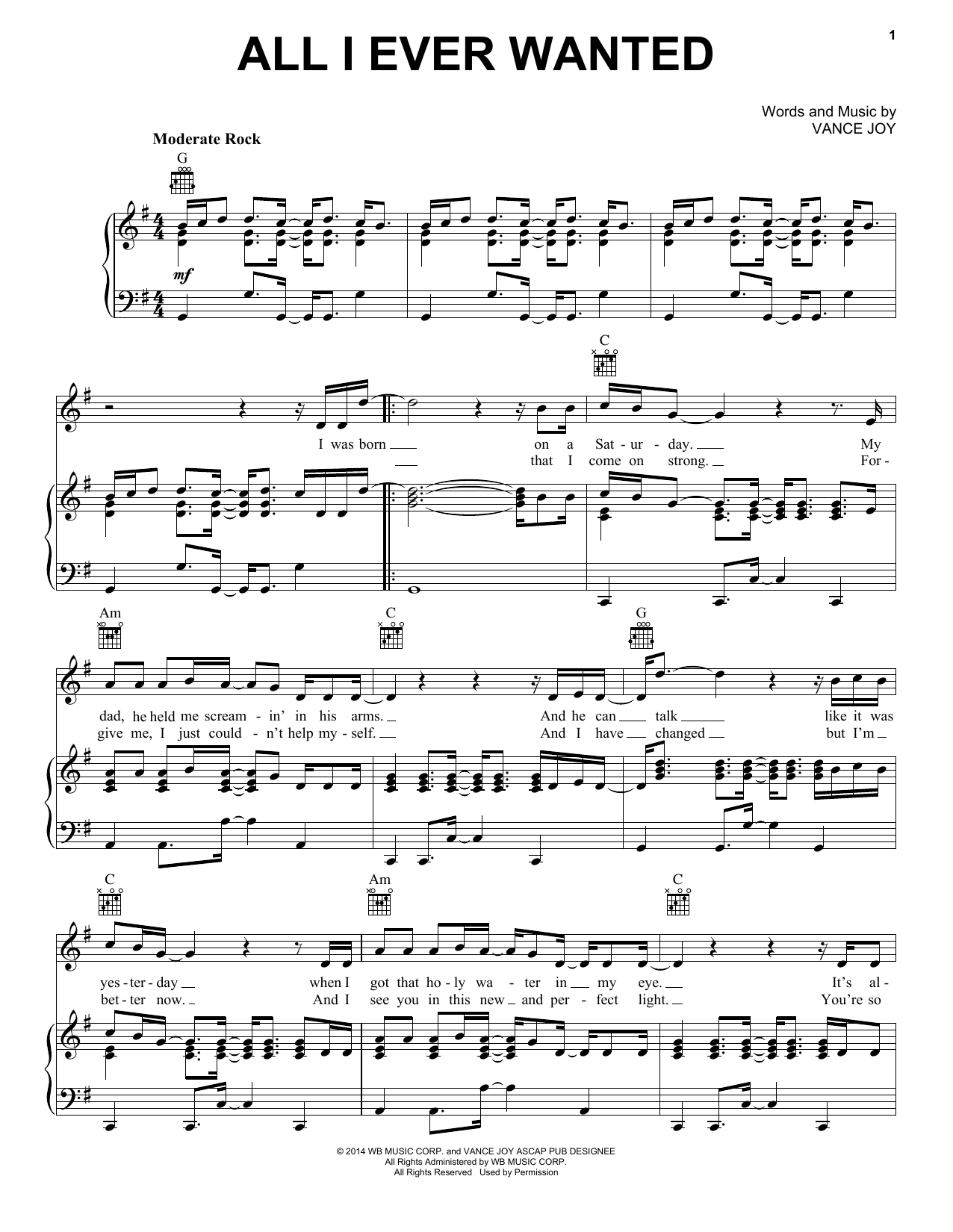 Download or print Vance Joy All I Ever Wanted sheet music, chords and digital score arranged for Piano, Vocal & Guitar Chords (Right-Hand Melody). This Pop score includes 4 page(s).