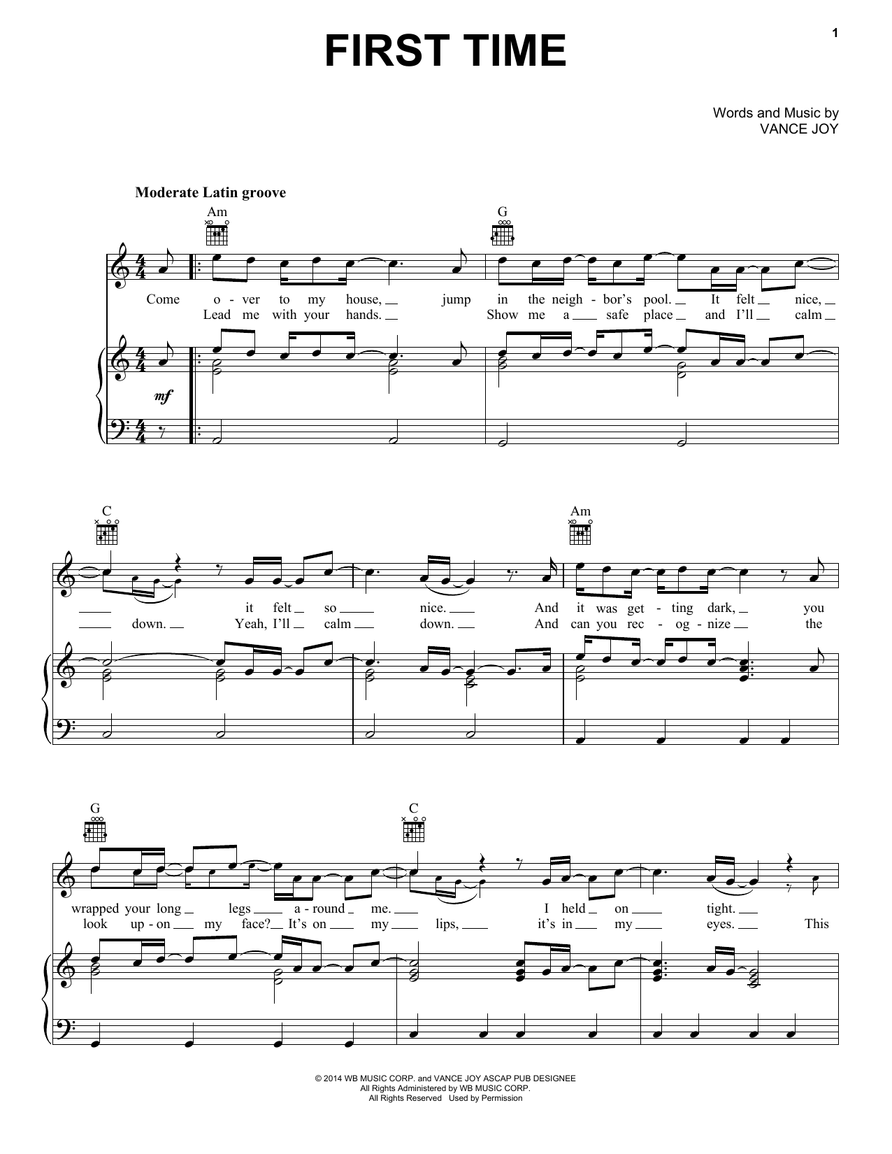 Download or print Vance Joy First Time sheet music, chords and digital score arranged for Piano, Vocal & Guitar Chords (Right-Hand Melody). This Pop score includes 6 page(s).