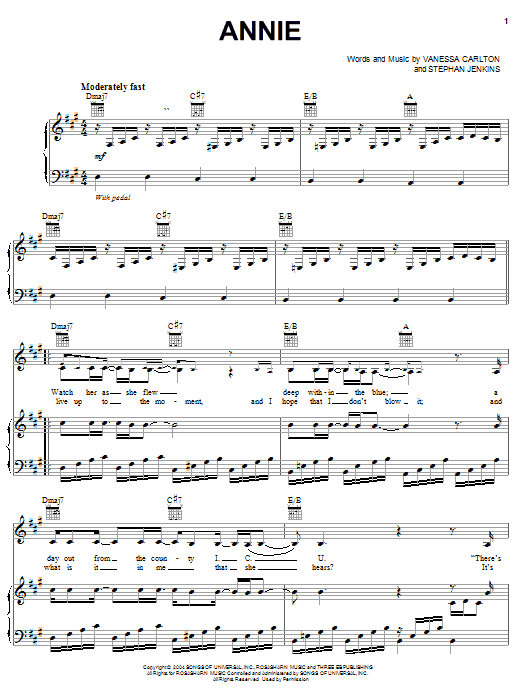 Download or print Vanessa Carlton Annie sheet music, chords and digital score arranged for Piano, Vocal & Guitar Chords (Right-Hand Melody). This Pop score includes 10 page(s).