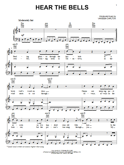 Download or print Vanessa Carlton Hear The Bells sheet music, chords and digital score arranged for Piano, Vocal & Guitar Chords (Right-Hand Melody). This Pop score includes 6 page(s).