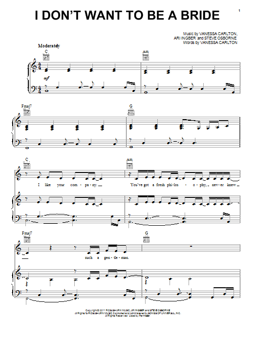 Download or print Vanessa Carlton I Don't Want To Be A Bride sheet music, chords and digital score arranged for Piano, Vocal & Guitar Chords (Right-Hand Melody). This Pop score includes 9 page(s).
