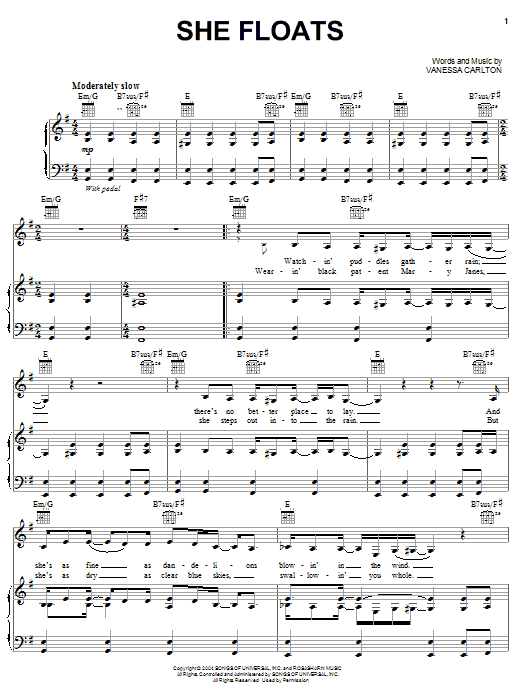 Download or print Vanessa Carlton She Floats sheet music, chords and digital score arranged for Piano, Vocal & Guitar Chords (Right-Hand Melody). This Pop score includes 6 page(s).