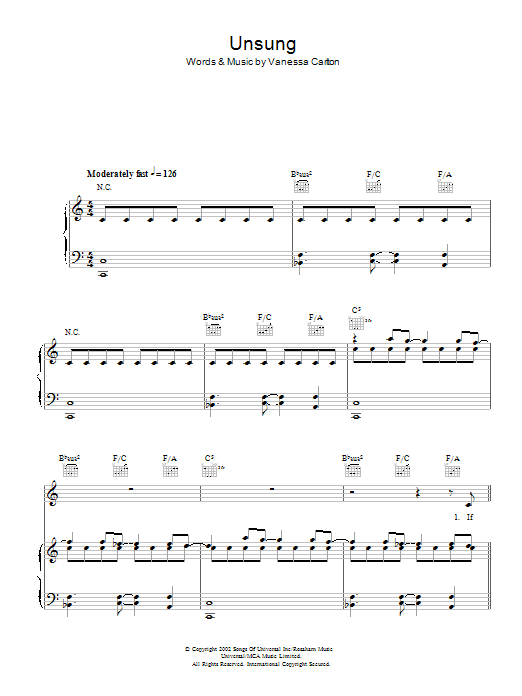 Download or print Vanessa Carlton Unsung sheet music, chords and digital score arranged for Piano, Vocal & Guitar Chords. This Pop score includes 10 page(s).