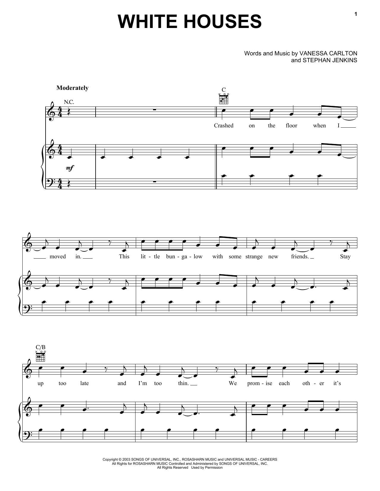 Download or print Vanessa Carlton White Houses sheet music, chords and digital score arranged for Easy Piano. This Pop score includes 10 page(s).