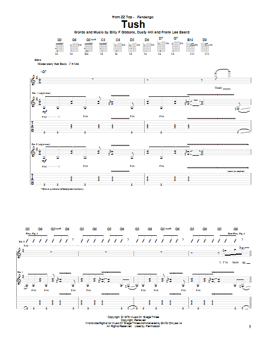 Download or print ZZ Top Tush sheet music, chords and digital score arranged for Easy Bass Tab. This Jazz score includes 1 page(s).