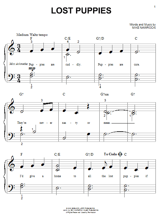 Download or print VeggieTales Lost Puppies sheet music, chords and digital score arranged for Big Note Piano. This Children score includes 3 page(s).