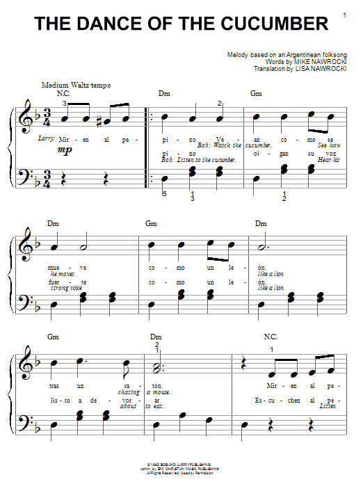 Download or print VeggieTales The Dance Of The Cucumber sheet music, chords and digital score arranged for Big Note Piano. This Children score includes 4 page(s).