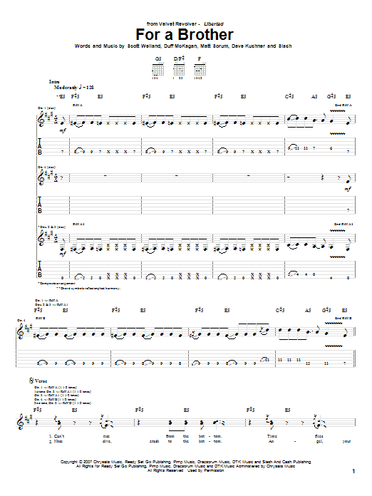 Download or print Velvet Revolver For A Brother sheet music, chords and digital score arranged for Guitar Tab. This Metal score includes 8 page(s).