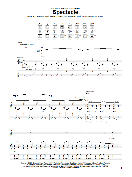 Download or print Velvet Revolver Spectacle sheet music, chords and digital score arranged for Guitar Tab. This Metal score includes 14 page(s).