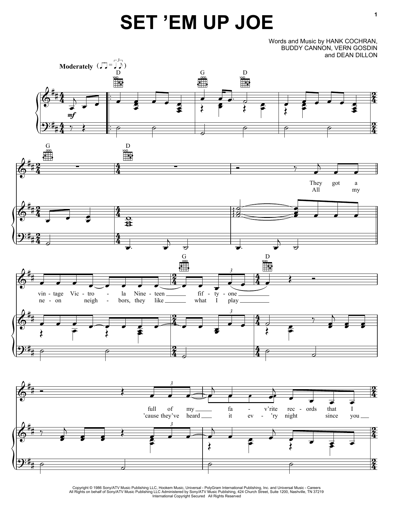 Download or print Vern Gosdin Set 'Em Up Joe sheet music, chords and digital score arranged for Piano, Vocal & Guitar Chords (Right-Hand Melody). This Country score includes 4 page(s).
