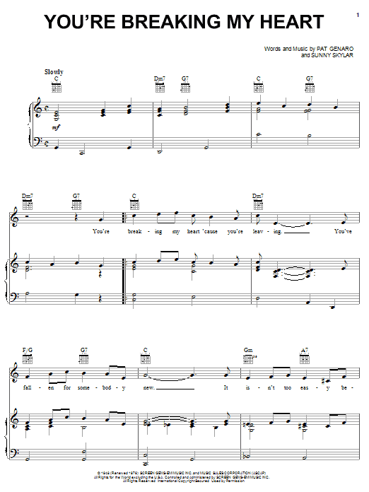 Download or print Vic Damone You're Breaking My Heart sheet music, chords and digital score arranged for Piano, Vocal & Guitar Chords (Right-Hand Melody). This Country score includes 3 page(s).