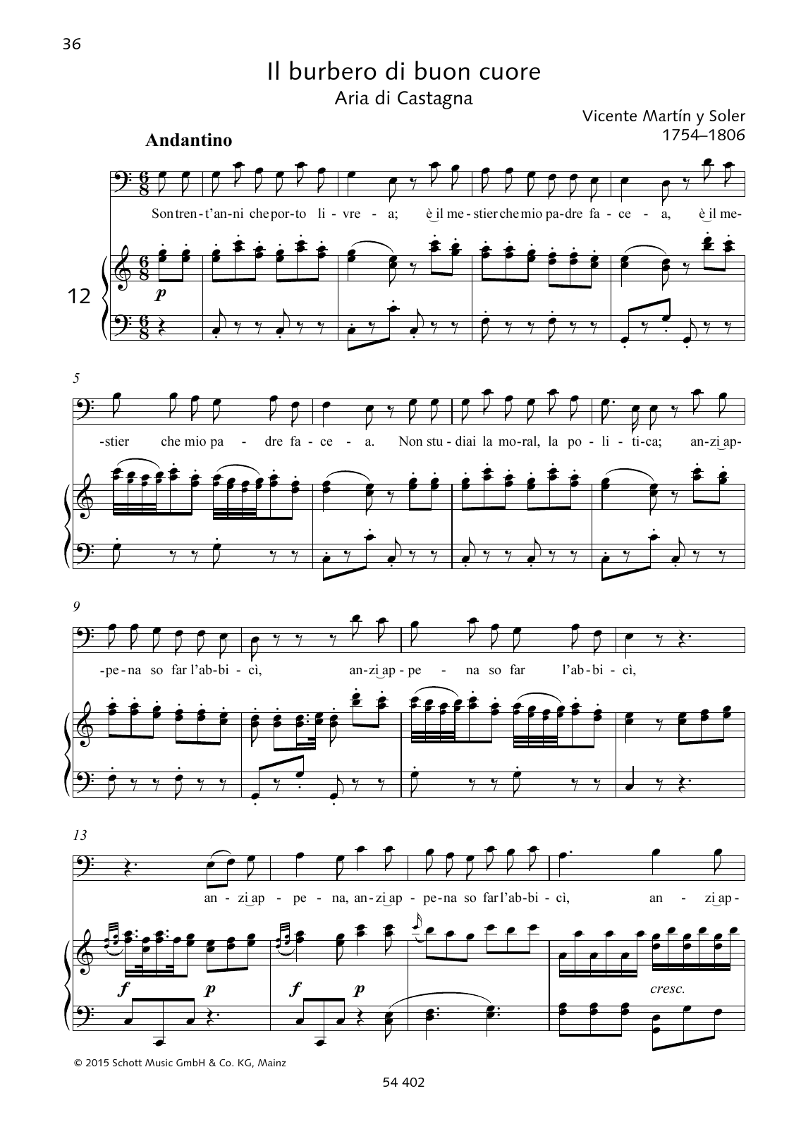 This composition is beautifuly arranged for Piano & Vocal includes 6 page(s). It is performed by Vicente Martín y Soler. The style of the score is 'Classical'. Catalog SKU number of the notation is 363495.